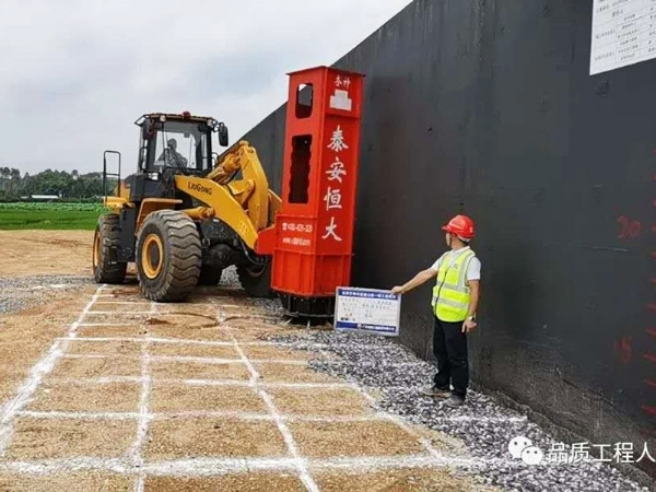 層厚標(biāo)記采用定制15cm紅白相間的反光貼紙控制層厚,并公示臺背責(zé)任卡,使用高速液壓夯實機(jī)進(jìn)行夯實,提高涵背填筑質(zhì)量。